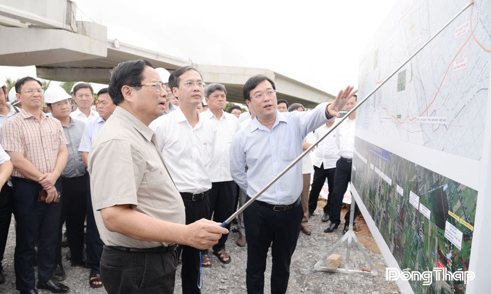 Thủ tướng Chính phủ Phạm Minh Chính khảo sát thực tế tiến độ thi công công trình cao tốc Cao Lãnh - An Hữu. Ảnh: M. Thành