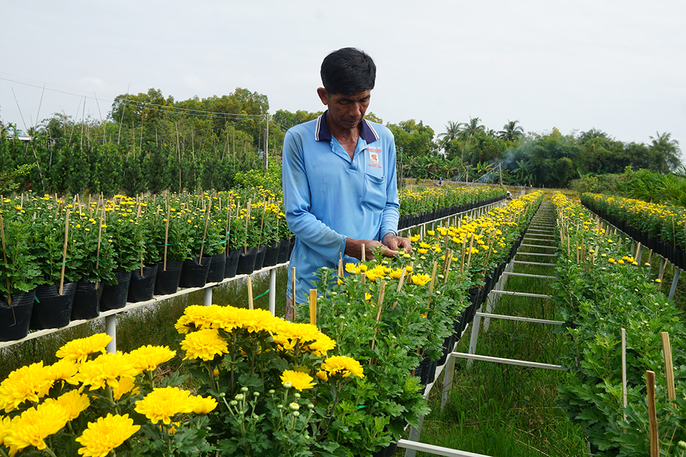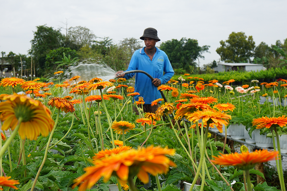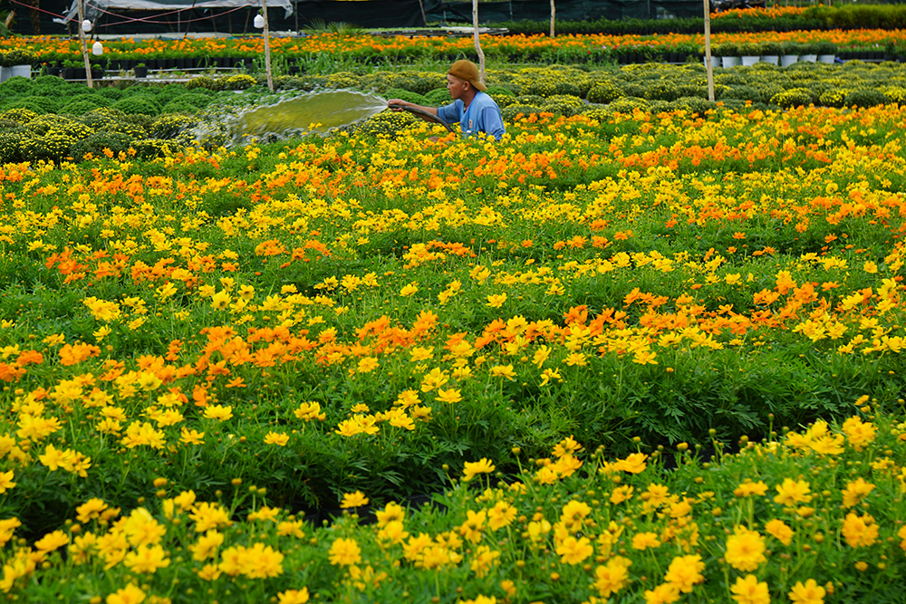 Nông dân Huỳnh Hữu Phước chăm sóc những giỏ hoa cúc tiger, một trong những loại hoa phục vụ riêng cho Festival