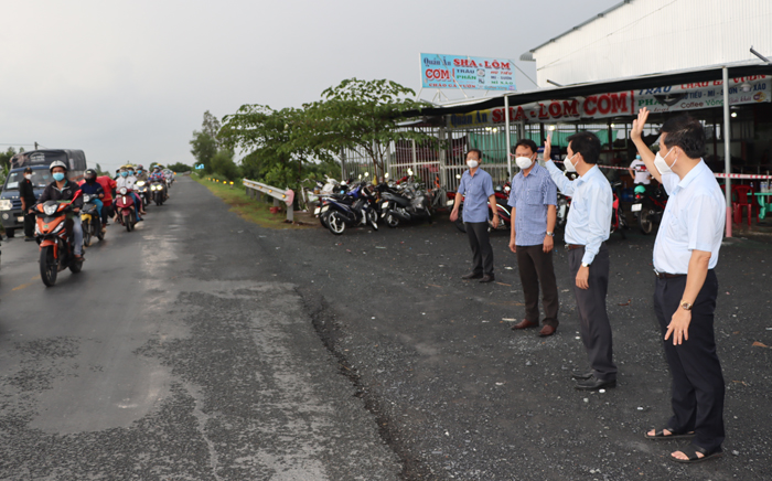 Ông Phạm Thiện Nghĩa (bìa phải) chào đón bà con trở về địa phương tại chốt kiểm soát trên tuyến Quốc lộ N2 thuộc địa phận xã Đốc Binh Kiều, huyện Tháp Mười.