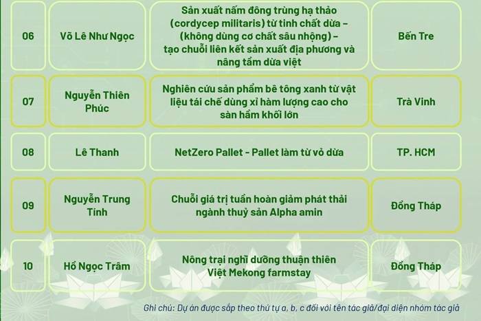 Trong đó, tỉnh Đồng Tháp có 04 tác giả gồm: Lê Minh Hiếu (dự án Thu gom và xử lý chất thải hữu cơ từ ngành công nghiệp cá tra - Ủ biogas và sản xuất năng lượng tái tạo); Võ Duy Khánh (dự án Bộ sản phẩm xanh ENDOTA sản xuất từ phụ phẩm nông nghiệp); Nguyễn Trung Tính (dự án Chuỗi giá trị tuần hoàn, giảm phát thải ngành thủy sản Alphamin); Hồ Ngọc Trâm (dự án Nông trại nghỉ dưỡng thuận thiên Việt Mekong farmstay). Thành phố Hồ Chí Minh có 02 tác giả, Lê Thanh (dự án NetZero Pallet – pallet làm từ vỏ dừa) và Lê Thị Thu Ngân (dự án Airboots – robot siêu nhẹ chăm sóc cây lúa với 03 chức năng gieo hạt, phun thuốc và bón phân).