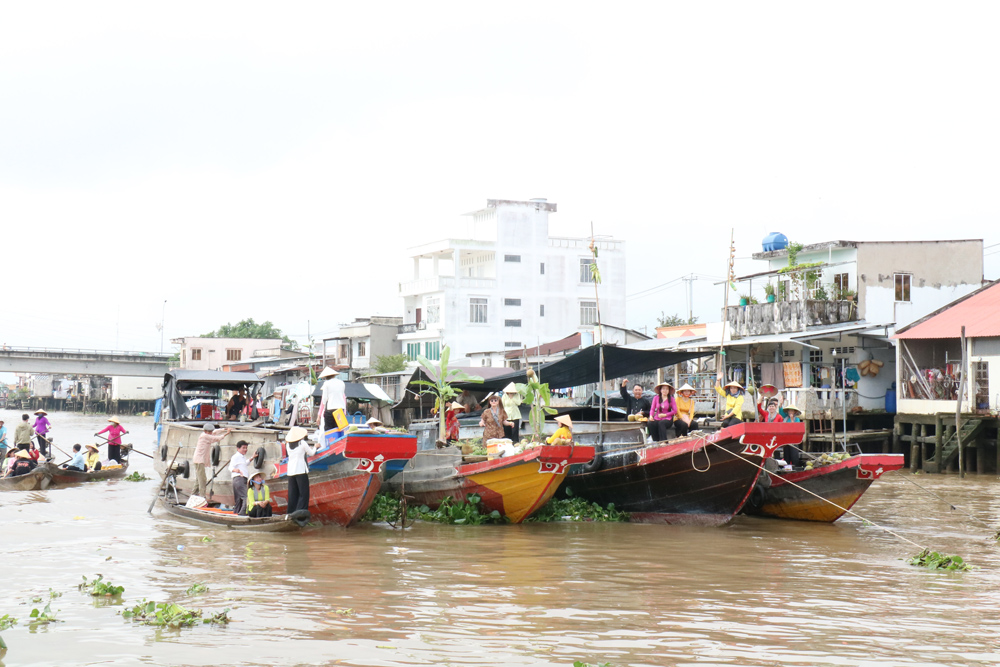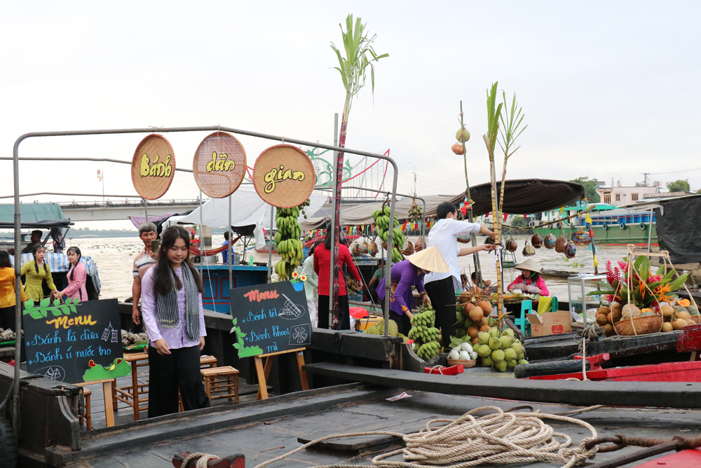 Không gian chợ nổi được tái hiện sinh động với ghe, xuồng, hàng hóa tấp nập