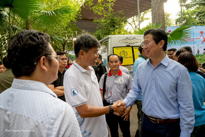 Bí thư Tỉnh ủy Lê Quốc Phong (giữa), Tiến sĩ Trần Triết – Hội Sếu Quốc Tế và bà Lê Nhật Thùy - Phó Tổng Giám đốc cấp cao, Công ty Cổ phần Chăn nuôi C.P Việt Nam trao đổi về bảo tồn sếu