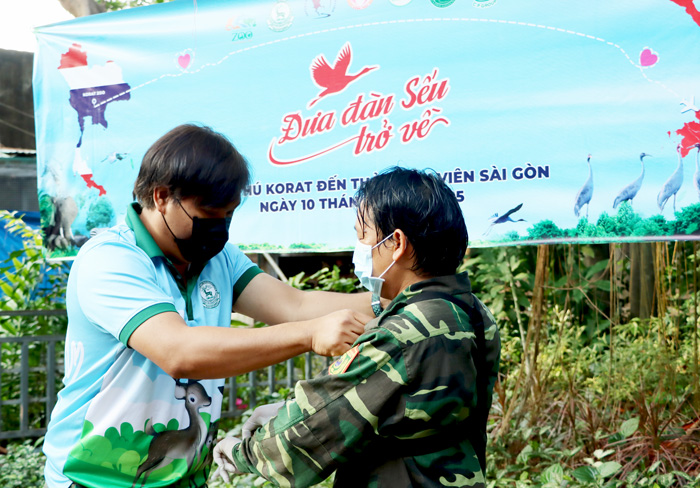 Cán bộ kỹ thuật (trực tiếp chăm sóc sếu) chuẩn bị đưa Sếu đầu đỏ về Vườn Quốc gia Tràm Chim