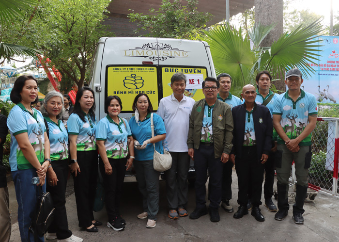 Tiến sĩ Trần Triết và ông Thanachon Kensingh - Giám đốc vườn thú Nakhon Ratchasima và các thành viên của vườn thú chụp ảnh lưu niệm trước khi xe vận chuyển sếu di chuyển