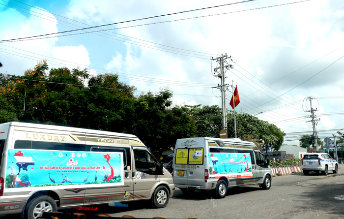Xe vận chuyển sếu qua địa phận huyện Cao Lãnh, tỉnh Đồng Tháp được dừng lại để kiểm tra tình hình sức khỏe sếu