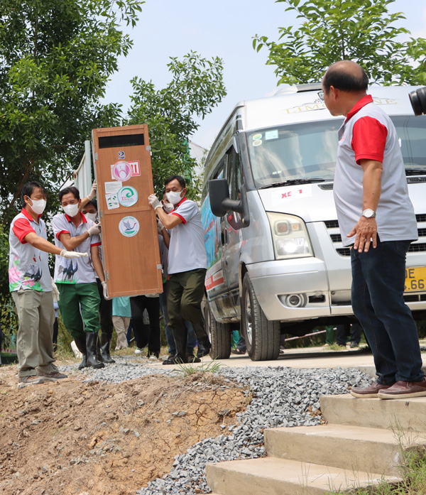 Cán bộ Vườn Quốc gia Tràm Chim và Thảo Cầm Viên Sài Gòn, các chuyên gia Thái Lan đưa Sếu đầu đỏ vào chuồng tại Thảo Cầm Viên Sài Gòn ngay sau khi đến nơi