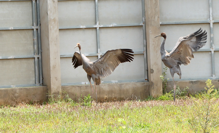 02 cá thể Sếu vỗ cánh, di chuyển trong môi trường mới