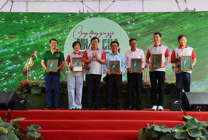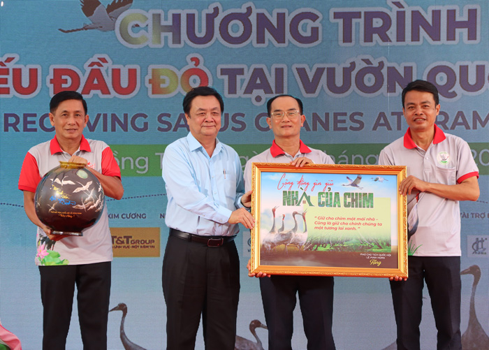 Phó Chủ tịch Quốc hội Lê Minh Hoan tặng bức tranh với thông điệp “Cộng đồng gìn giữ Nhà của chim” và bình gốm lưu niệm “Một cánh sếu – giữ ngàn xanh” cho Ban Giám đốc Vườn Quốc Gia Tràm Chim