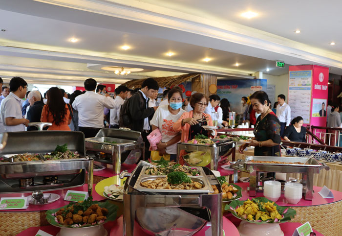 Không chỉ tâm tình, chia sẻ với nhau câu chuyện đầu năm, những người con quê hương Đồng Tháp còn được thưởng thức sản vật quê mình. Đó là không gian trưng bày các sản phẩm OCOP, sản phẩm khởi nghiệp của các bạn trẻ Đồng Tháp và rất nhiều món ăn được chế biến từ sen để phục vụ bà con đồng hương.
