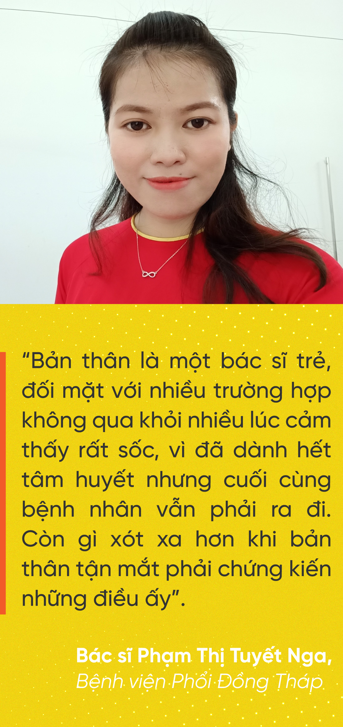 Gác lại niềm riêng và những lo lắng cho gia đình, Bác sĩ trẻ Phạm Thị Tuyết Nga (sinh năm 1994) cùng các đồng nghiệp tại Bệnh viện Phổi Đồng Tháp tham gia làm nhiệm vụ phòng, chống dịch Covid-19. Là người trực tiếp đảm nhận nhiệm vụ điều trị bệnh nhân Covid-19 tại khu Hồi sức tích cực (ICU), nơi mà hằng ngày phải đối mặt với nhiều trường hợp bệnh nhân nặng, Bác sĩ Nga chia sẻ, tham gia chống dịch từ những ngày đầu tháng 6/2021 - thời điểm mà bản thân và các bác sĩ tại Bệnh viện chưa có nhiều kinh nghiệm trong điều trị bệnh nhân Covid-19 và đây còn là khu vực tiếp nhận bệnh nhân tầng 3 có rất nhiều thủ thuật tạo khí dung, nguy cơ lây nhiễm cao nên cũng có chút lo lắng.