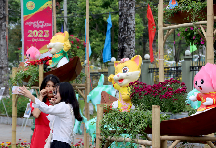Nhiều bạn trẻ tạo dáng bên các tiểu cảnh, ghi lại thời khắc thanh xuân tươi đẹp