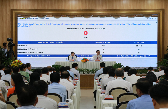 Hội đồng nhân dân tỉnh biểu quyết thông qua 18 Nghị quyết về kinh tế - xã hội. Trong đó có Nghị quyết về việc lựa chọn huyện thực hiện thí điểm cơ chế phân cấp trong quản lý, tổ chức thực hiện các Chương trình mục tiêu quốc gia giai đoạn 2024 – 2025; thông qua kế hoạch đầu tư công năm 2025 nguồn ngân sách nhà nước do Tỉnh quản lý và phân bổ (đợt 1); danh mục chuyển mục đích sử dụng đất trồng lúa để thực hiện dự án năm 2025 trên địa bàn tỉnh Đồng Tháp v.v..
