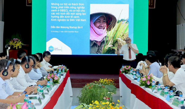 Theo đó, ông Guenther Reinhard Meyer - Quản lý dự án VN-ADAPT, Tổ chức SNV Việt Nam đã trình bày tham luận về cơ hội, thách thức hiện hữu trong phát triển Nông nghiệp xanh tại Đồng bằng sông Cửu Long và “không gian” cho các mô hình Đổi mới sáng tạo theo định hướng kinh tế xanh. Qua các trở ngại về sản xuất nông nghiệp quy mô nhỏ, năng suất và hiệu quả thấp; liên kết chuỗi giá trị yếu kém, thiếu thiết bị, cơ sở hạ tầng v.v., SNV Việt Nam đưa ra khuyến nghị về thích ứng và chống chịu với khí hậu thông qua nông nghiệp bền vững và tái sinh; giảm thiểu tác động của biến đổi khí hậu trong nông nghiệp, lâm nghiệp và sử dụng đất. Trong đó, nhấn mạnh đến một số nội dung về thích ứng biến đổi khí hậu dựa vào tự nhiên trong nông nghiệp thông qua chuyển đổi khu vực tư nhân tại Việt Nam, chuyển đổi chuỗi giá trị lúa gạo ứng phó với biến đổi khí hậu và phát triển bền vững ở khu vực Đồng bằng sông Cửu Long, chuyển dịch đầu tư theo hướng chuyển đổi xanh v.v..