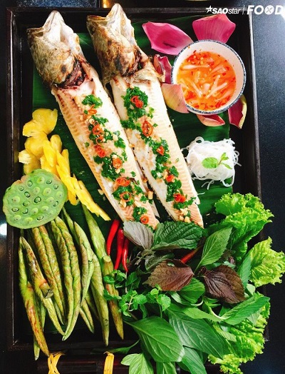 Cá lóc nướng trui cuốn đọt sen non