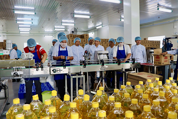 Ông Phạm Thiện Nghĩa tham quan quy trình đóng gói dầu gạo tại Công ty Trách nhiệm hữu hạn Dầu Gạo Sethia Hemraj