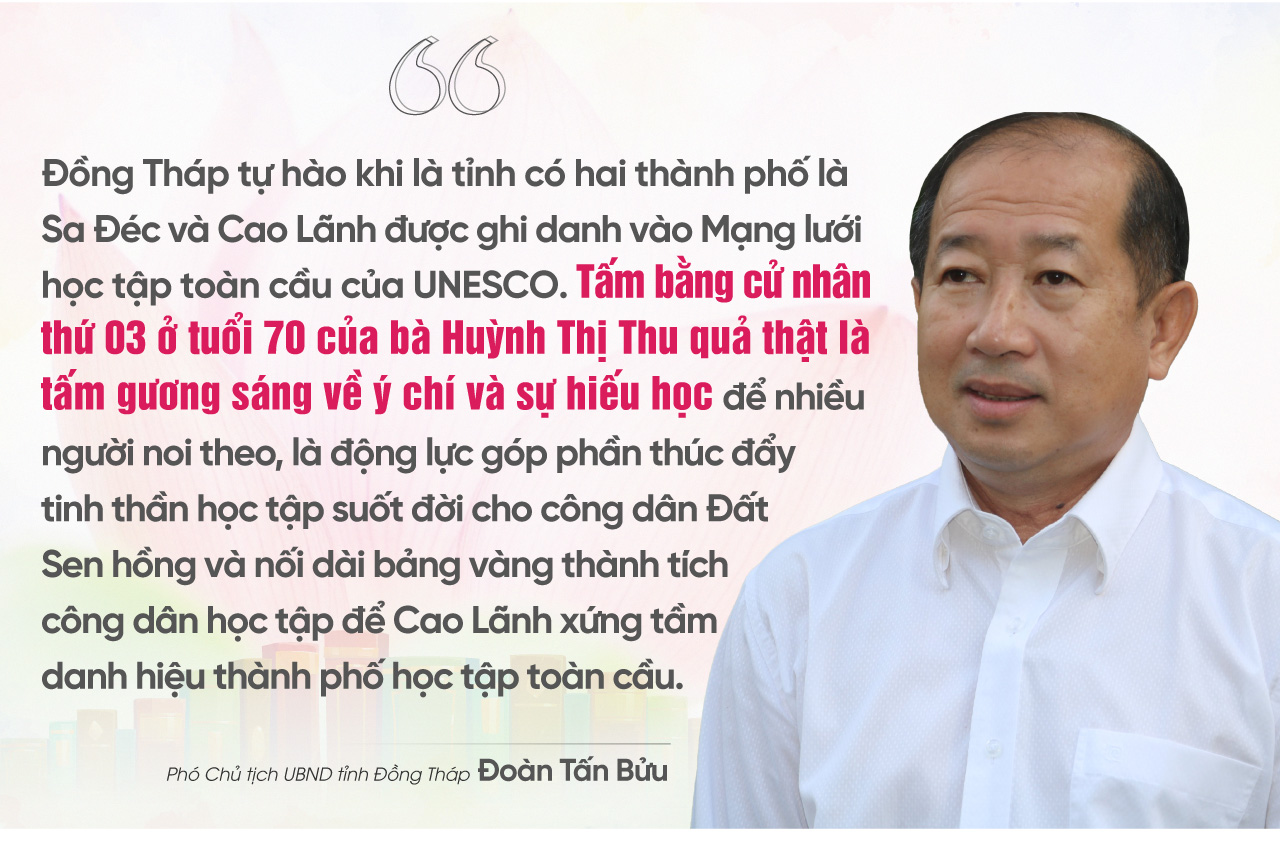 Ởấp Tân Tịch, xã Tịnh Thới, thành phố Cao Lãnh (Đồng Tháp) có một người đã dành cả thanh xuân của mình cho sự nghiệp trồng người và việc học. Đó là bà Huỳnh Thị Thu (sinh năm 1952) - người vừa nhận bằng cử nhân thứ 3 khi đã 70 tuổi. Giữa bộn bề của cuộc sống thường nhật, tấm bằng cử nhân của bà Thu quả thật là gương sáng về tinh thần học tập, truyền cảm hứng cho thế hệ trẻ.