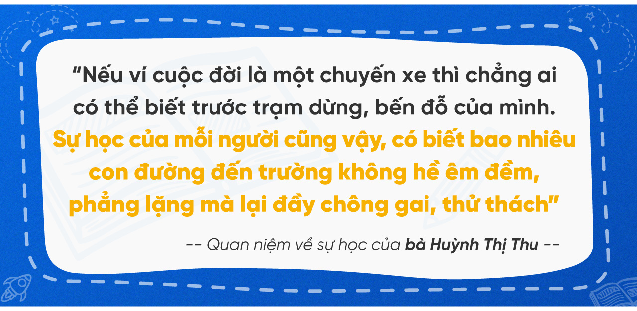Bà Thu tâm sự: Thế giới, cuộc sống luôn vận động, phát triển do đó không học thì sẽ ở lại phía sau, lạc hậu so với thời đại như câu ngạn ngữ “Sự học như thuyền đi trên dòng nước ngược, không tiến ắt phải lùi”.
