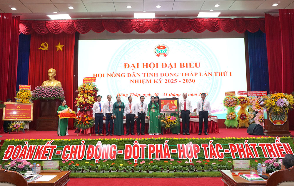 Ban Chấp hành Hội Nông dân tỉnh Đồng Tháp khóa I, nhiệm kỳ 2025 - 2030 nhận Quyết định của Ban Chấp hành Trung ương Hội Nông dân Việt Nam, hoa chúc mừng của lãnh đạo tỉnh và ra mắt đại hội.