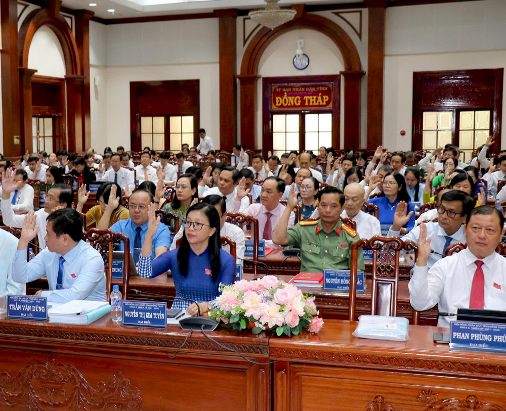 Tại kỳ họp, Hội đồng nhân dân tỉnh đã xem xét, thông qua 10 nghị quyết quan trọng. Đáng chú ý là Nghị quyết về Kế hoạch phát triển kinh tế - xã hội tỉnh Đồng Tháp năm 2026; Nghị quyết về việc thông qua danh mục công trình, dự án phải thu hồi đất năm 2026 trên địa bàn tỉnh Đồng Tháp; Nghị quyết quy định tiêu chí thành lập Đội dân phòng và tiêu chí về số lượng thành viên Đội dân phòng trên địa bàn tỉnh Đồng Tháp; Nghị quyết quy định mức chi đảm bảo hoạt động của Ban Chỉ đạo chống buôn lậu, gian lận thương mại và hàng giả tỉnh Đồng Tháp v.v..