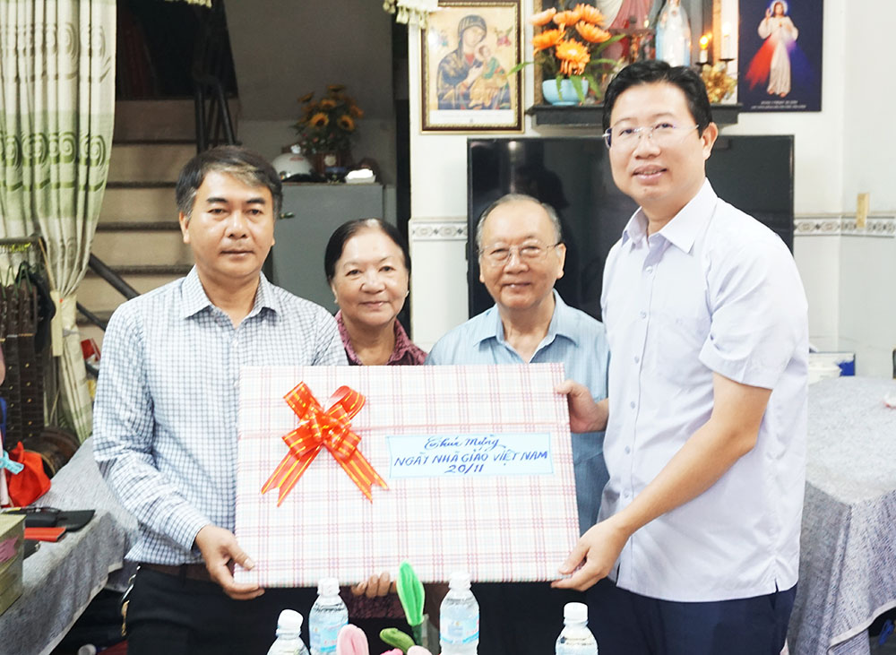 Tiếp đó, Đoàn đã đến thăm và chúc mừng tại nhà riêng của thầy Lê Uy Phong. Thầy Lê Uy Phong là một trong những nhà giáo tiêu biểu của Trường Trung học cơ sở Lê Ngọc Hân, đã có nhiều năm cống hiến cho sự nghiệp giáo dục và đạt nhiều thành tích trong công tác giảng dạy.