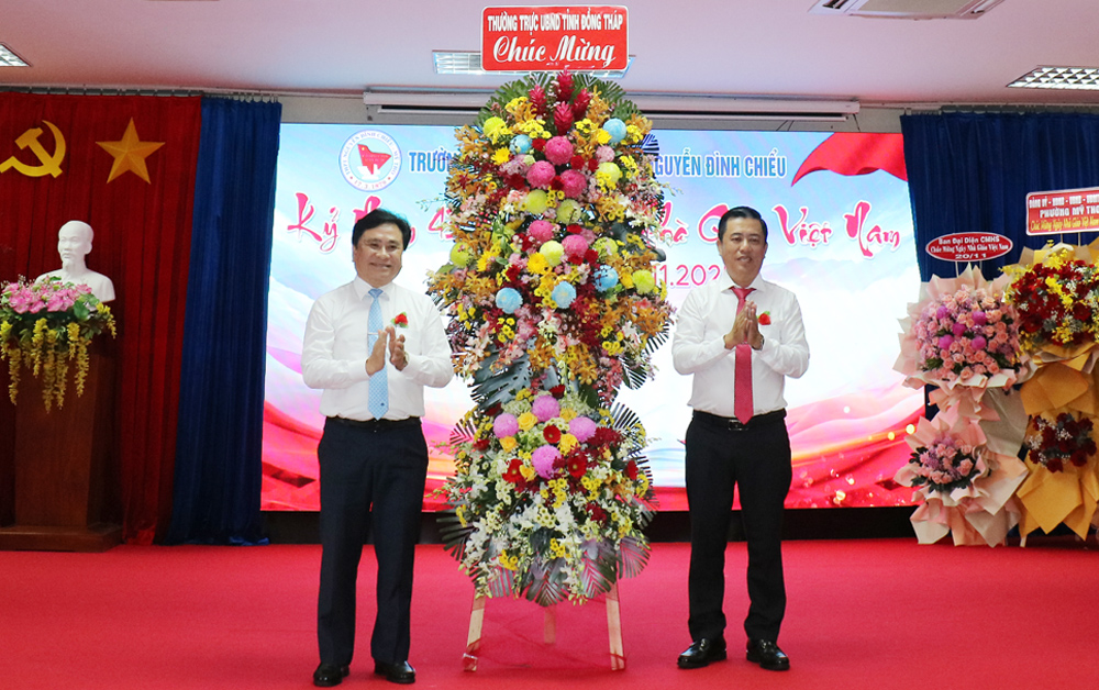 Phó Chủ tịch Ủy ban nhân dân tỉnh Trần Văn Dũng (bìa trái) tặng hoa chúc mừng Trường Trung học phổ thông Nguyễn Đình Chiểu