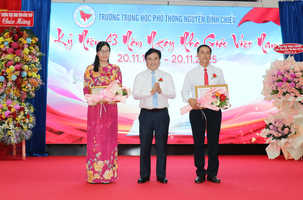 Dịp này, Ủy ban nhân dân tỉnh tặng Bằng khen cho cô Trần Thị Ngọc Thư - Tổ phó Tổ Sử - Địa - Giáo dục kinh tế và Pháp luật vì có thành tích trực tiếp giảng dạy học sinh đạt giải Ba tại Kỳ thi chọn học sinh giỏi quốc gia Trung học phổ thông năm học 2024 - 2025 và thầy Phạm Thành Nhân, giáo viên Tổ Thể dục - Quốc phòng an ninh, vì có thành tích huấn luyện học sinh đạt Huy chương Đồng môn bơi lội tại Giải Thể dục thể thao học sinh toàn quốc năm 2025.