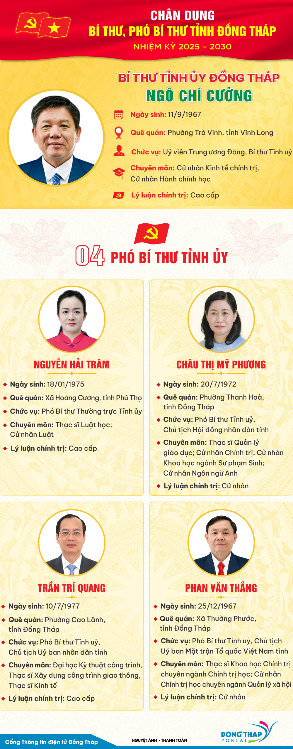 [Infographic] Chân dung tân Bí thư, các Phó Bí thư Tỉnh uỷ Đồng Tháp