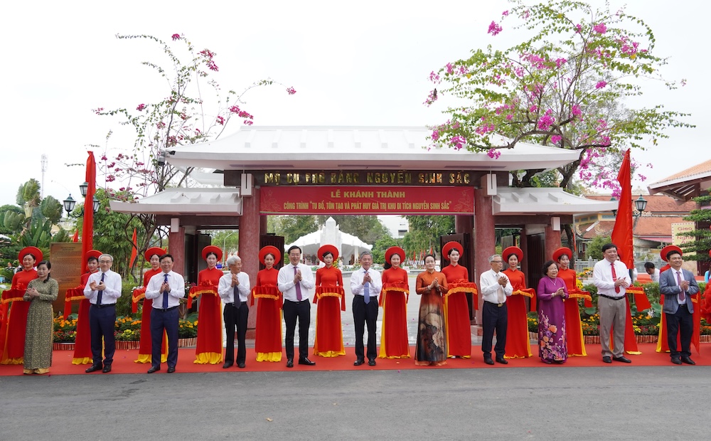Lãnh đạo Trung ương, lãnh đạo tỉnh Đồng Tháp và đại diện dòng họ Nguyễn Sinh cắt băng khánh thành công trình “Tu bổ, tôn tạo và phát huy giá trị Khu di tích Nguyễn Sinh Sắc”. Ảnh: Việt Tiến