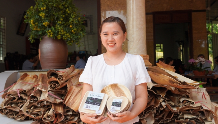 “Bên cạnh việc bán cây giống, tôi cùng chồng quyết định đầu tư máy móc để sản xuất ra các sản phẩm từ mo cau. Hiện tại, cơ sở của chúng tôi đã sản xuất được 15 loại sản phẩm từ mo cau như: chén, dĩa, muỗng, quạt v.v.. Những sản phẩm này 100% làm từ mo cau, dùng nhiệt độ cao để ép thành khuôn, không chứa phẩm màu, hóa chất nên không chỉ an toàn cho người dùng mà còn thân thiện với môi trường”, chị Ngọc An chia sẻ.