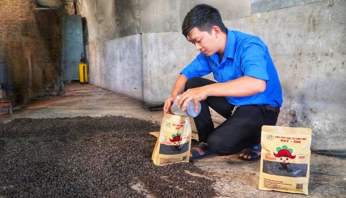 Anh Nguyễn Trường An đang đóng gói phân bón hữu cơ dạng viên nén làm từ vỏ ấu