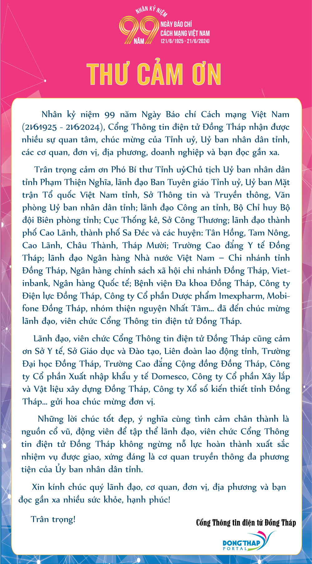 Nhân kỷ niệm 99 năm Ngày Báo chí Cách mạng Việt Nam (21/6/1925 - 21/6/2024), Cổng Thông tin điện tử Đồng Tháp nhận được nhiều sự quan tâm, chúc mừng của Tỉnh uỷ, Uỷ ban nhân dân tỉnh, các cơ quan, đơn vị, địa phương, doanh nghiệp và bạn đọc gần xa.