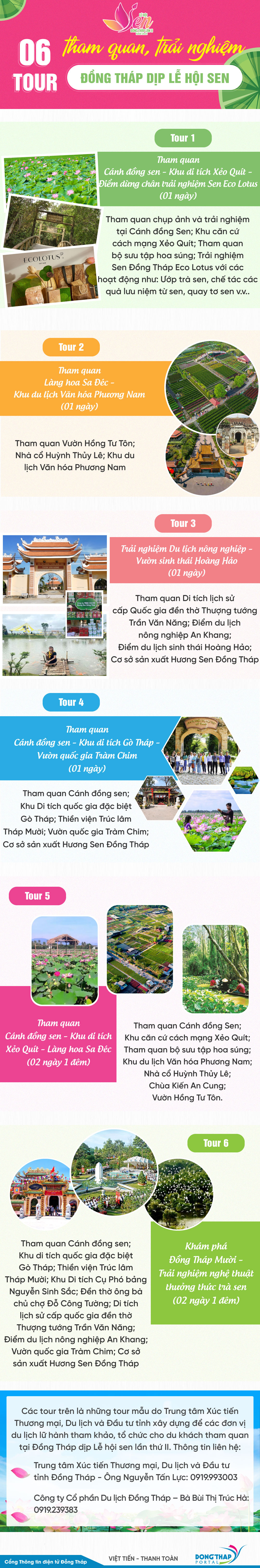 Trung tâm Xúc tiến Thương mại, Du lịch và Đầu tư tỉnh xây dựng 06 tour tham quan và khám phá Đồng Tháp nhân dịp diễn ra Lễ hội Sen Đồng Tháp lần thứ II năm 2024, từ ngày 16 đến 19/5. Mời quý độc giả xem qua infographic dưới đây để lựa chọn các tour, cùng chiêm ngưỡng và cảm nhận trọn vẹn vẻ đẹp thuần khiết, thanh tao của hoa sen ở các cánh đồng, tham quan các di tích văn hóa mang đậm dấu ấn lịch sử, trải nghiệm các công đoạn làm ra sản phẩm từ sen v.v..