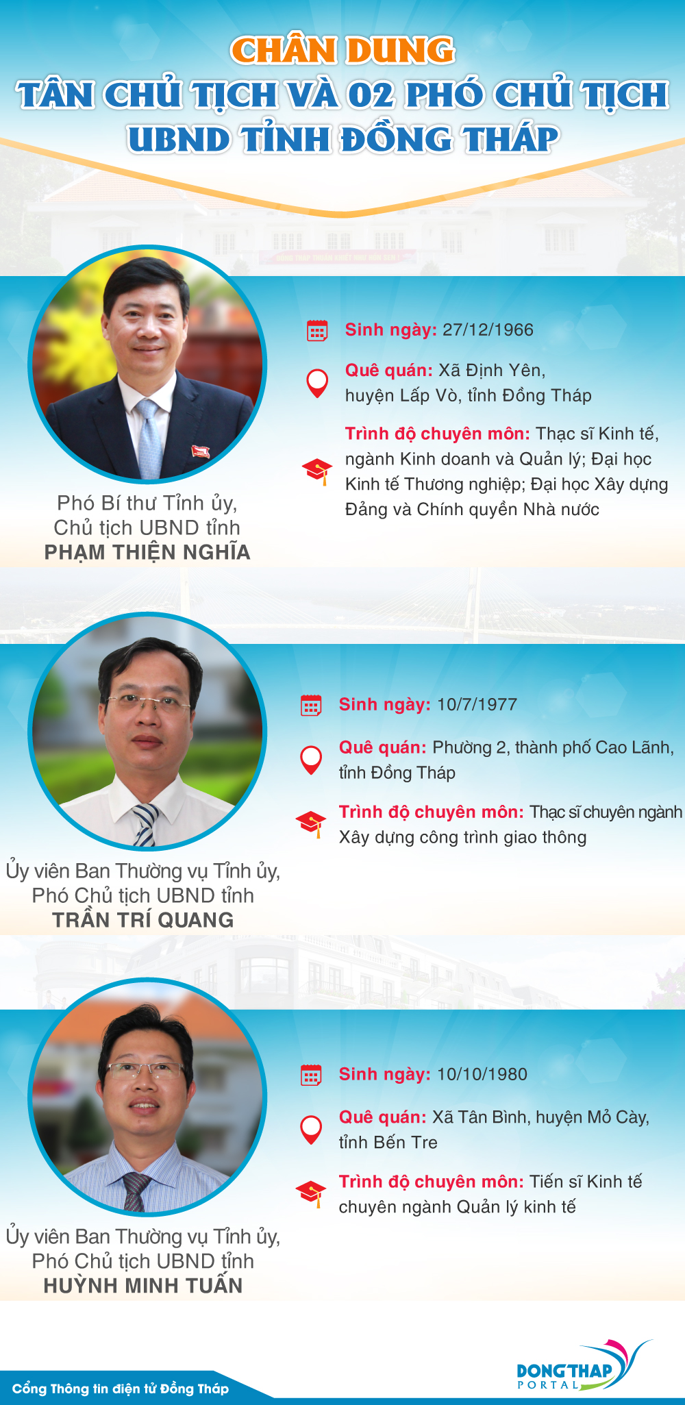 Cổng Thông tin điện tử Đồng Tháp trân trọng giới thiệu chân dung Chủ tịch và 02 Phó Chủ tịch Uỷ ban nhân dân tỉnh Đồng Tháp vừa được Hội đồng nhân dân tỉnh bầu cử qua Infographic dưới đây