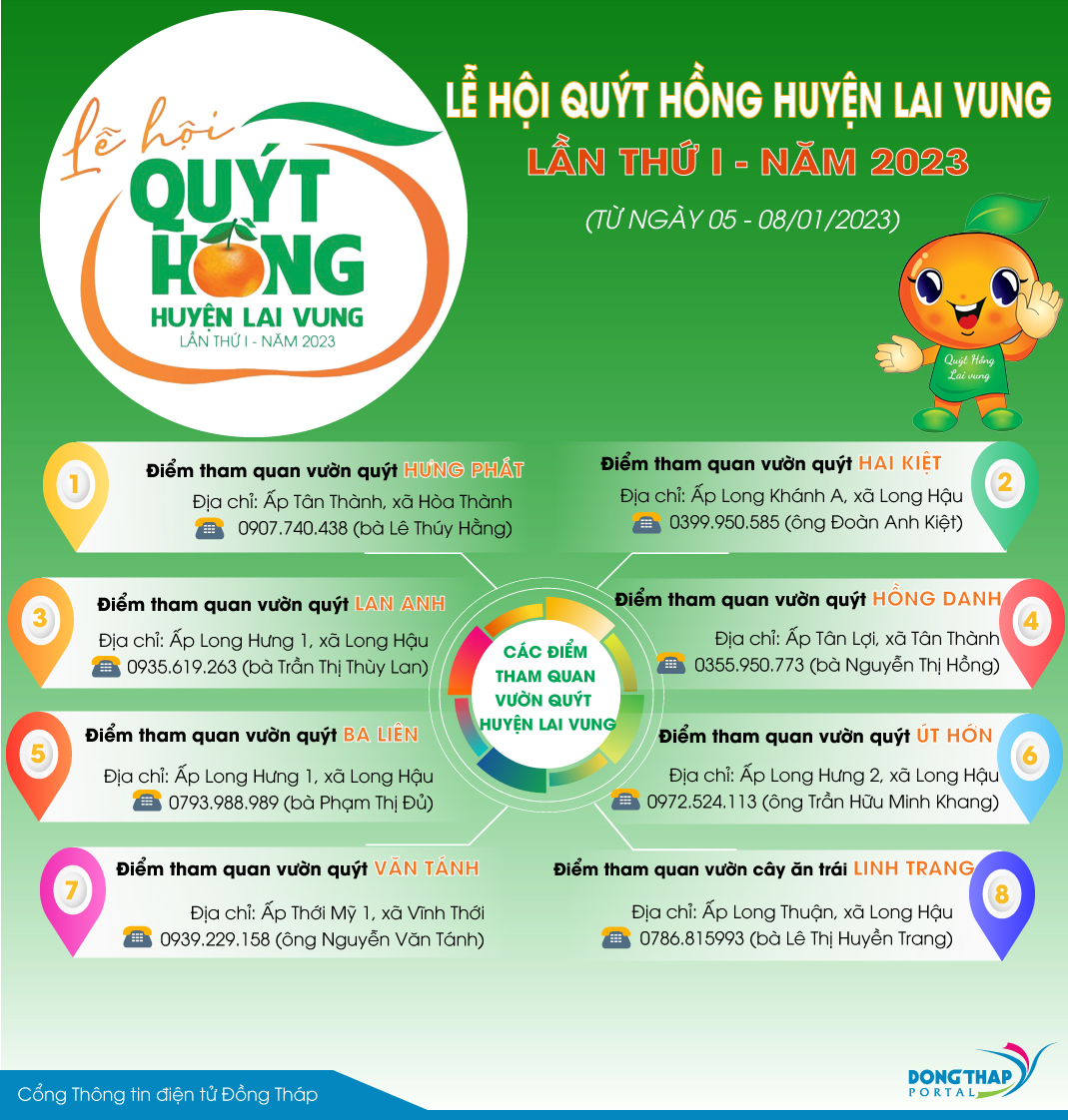 Lễ hội Quýt hồng huyện Lai Vung lần thứ I - năm 2023 sẽ được tổ chức từ ngày 05 - 08/01/2023 hứa hẹn sẽ thu hút đông đảo du khách các nơi về với Lai Vung. Dưới đây là danh sách các điểm tham quan vườn quýt mở cửa đón khách tham quan trong dịp Lễ hội và Tết này.
