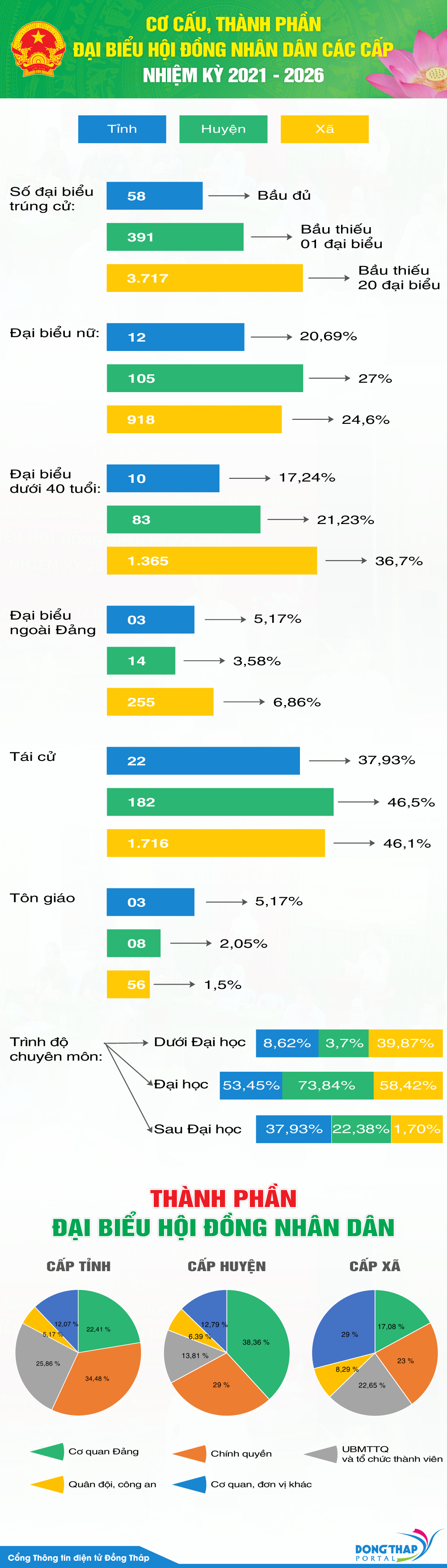 [Infographic] Cơ cấu, thành phần đại biểu HĐND các cấp trên địa bàn Đồng Tháp