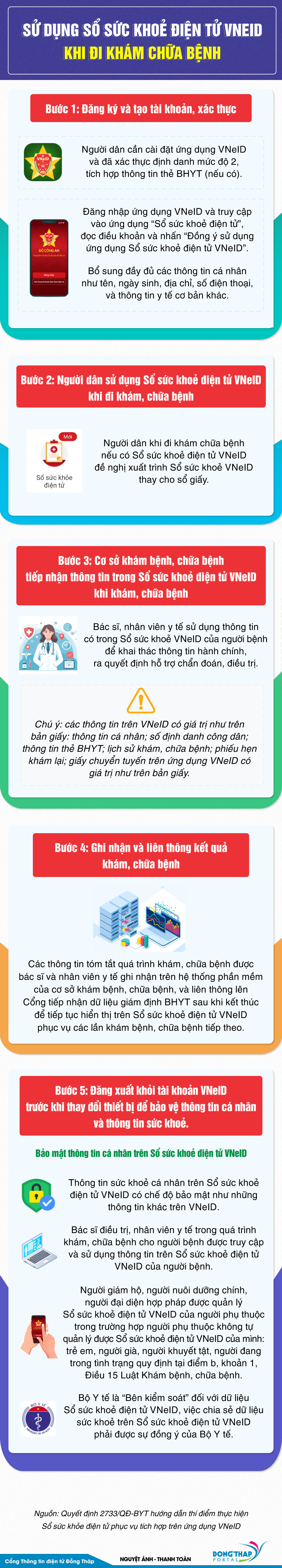 Bộ Y tế ban hành Quyết định số: 2733/QĐ-BYT hướng dẫn thí điểm thực hiện Sổ sức khỏe điện tử phục vụ tích hợp trên ứng dụng VNeID, trong đó hướng dẫn sử dụng Sổ sức khoẻ điện tử VNeID khi đi khám chữa bệnh. Xem infographic dưới đây về 05 bước thực hiện.