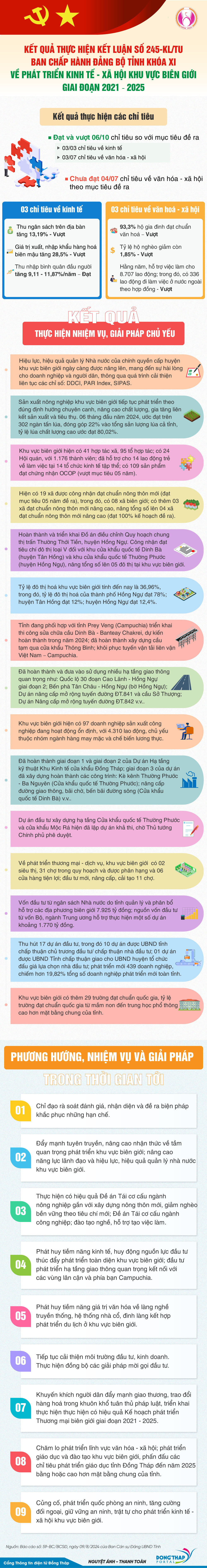Tháng 11/2021, Ban Chấp hành Đảng bộ tỉnh Đồng Tháp ban hành Kết luận số 245-KL/TU về phát triển kinh tế - xã hội khu vực biên giới tỉnh Đồng Tháp, giai đoạn 2021 – 2025, với mục tiêu phát triển kinh tế - xã hội khu vực biên giới theo hướng bền vững, ổn định dân cư, nâng cao đời sống vật chất và tinh thần cho nhân dân, bảo vệ vững chắc chủ quyền lãnh thổ, an ninh biên giới quốc gia. Đến nay, tiến độ thực hiện các mục tiêu cụ thể đạt khá tích cực.