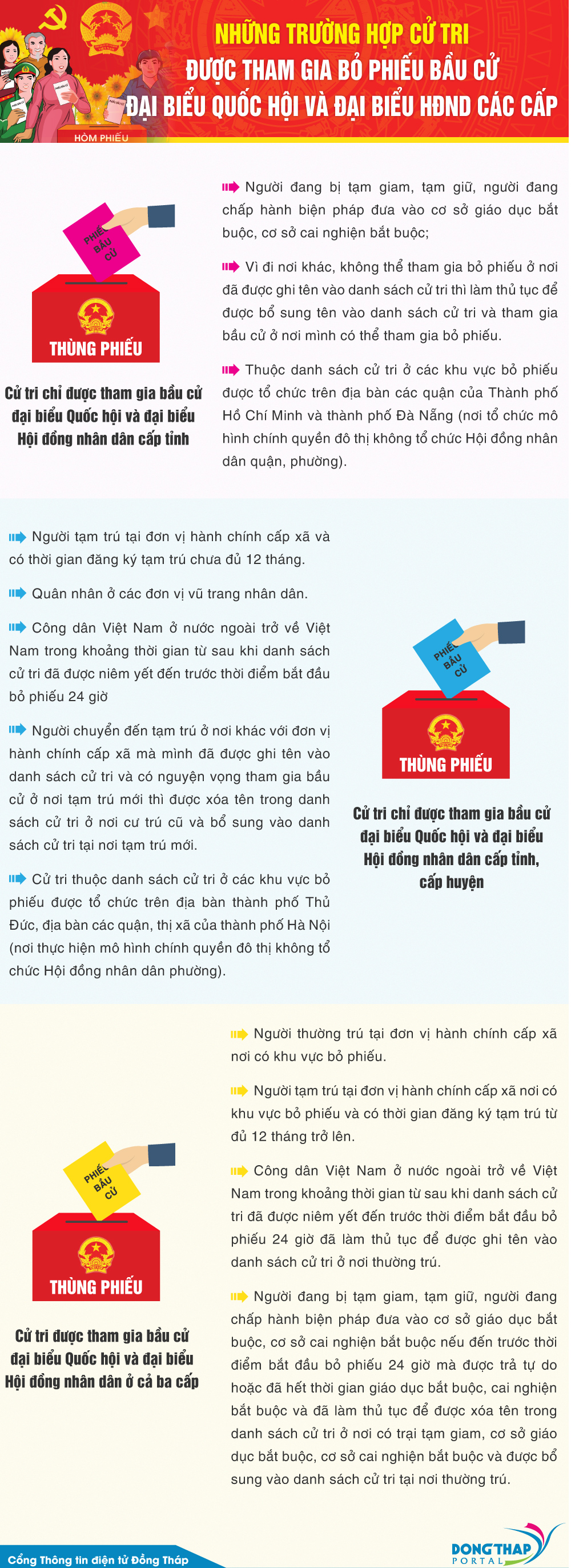 Quyền bầu cử đại biểu Quốc hội và đại biểu Hội đồng nhân dân các cấp của cử tri là không hoàn toàn giống nhau. Những trường hợp nào cử tri được bỏ phiếu bầu cử ở cả 03 cấp hay chỉ được bỏ phiếu ở cấp tỉnh, cấp huyện v.v.? Mời xem infographic dưới đây.