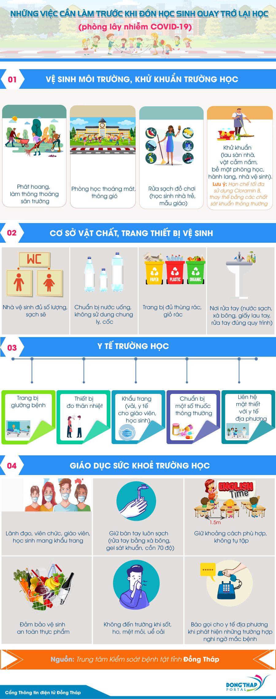 Từ ngày 27/4, tất cả học sinh khối 9 và khối 12 của tỉnh Đồng Tháp sẽ đi học trở lại. Để phòng ngừa lây nhiễm Covid-19 trong trường học, mời xem infographic dưới đây để biết về những việc cần làm trước khi đón học sinh quay trở lại học.