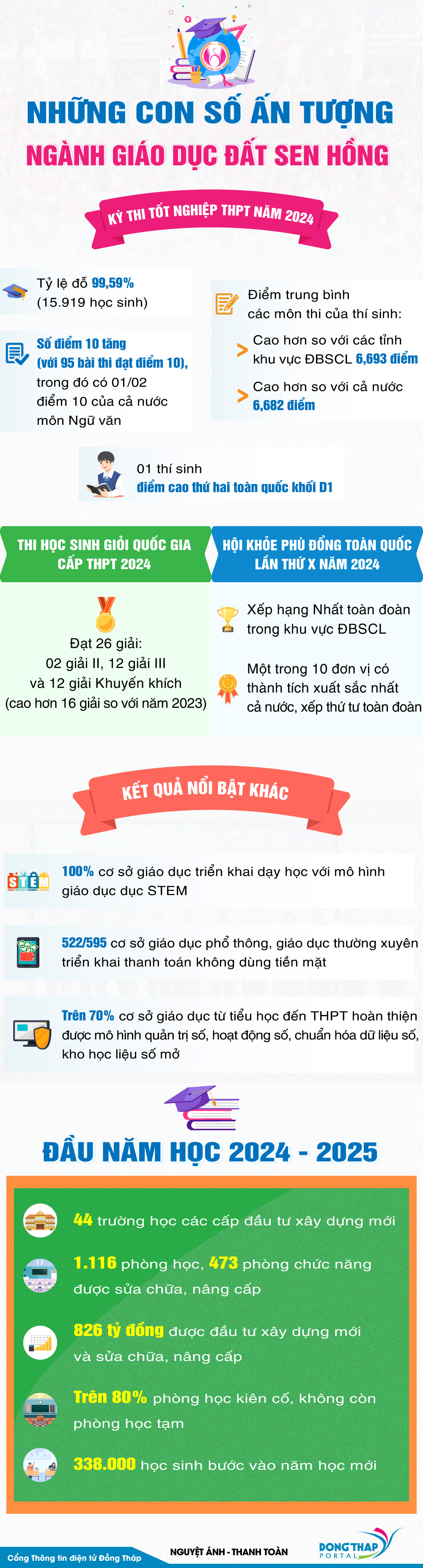 Năm học 2023 – 2024 khép lại, với nhiều kết quả nổi bật, cho thấy sự nỗ lực không ngừng của ngành giáo dục tỉnh Đồng Tháp, của thầy cô giáo và các em học sinh.