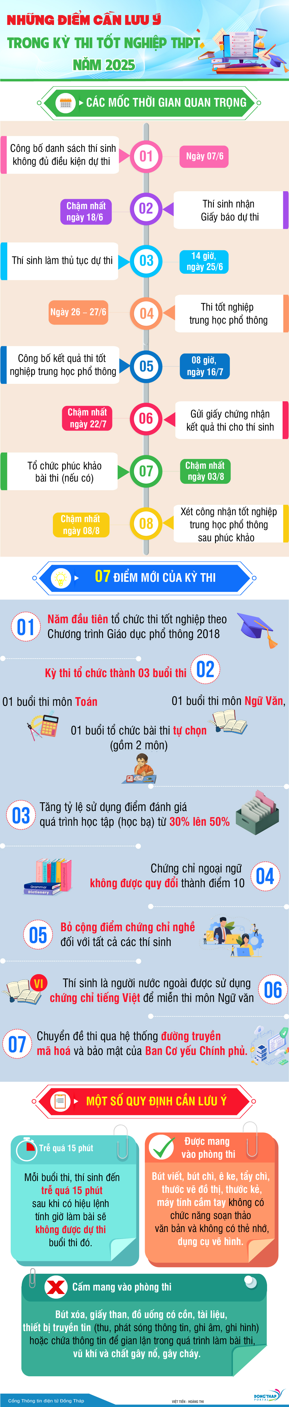 Kỳ thi tốt nghiệp trung học phổ thông năm 2025 sẽ diễn ra trong hai ngày 26 – 27/6. Đồng Tháp dự kiến có 17.752 thí sinh đăng ký dự thi, có 39 điểm thi, với 786 phòng thi. Thí sinh cần lưu ý các mốc thời gian và những điểm quan trọng trong quy chế thi để có sự chuẩn bị tốt nhất.