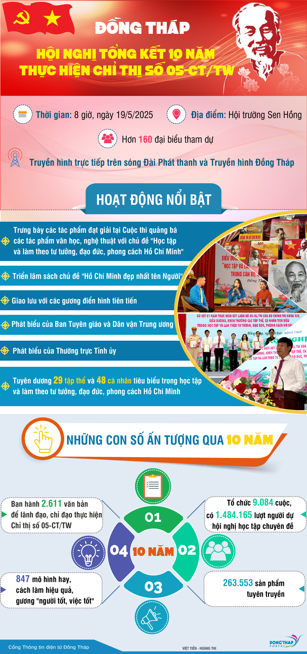 Hội nghị tổng kết 10 năm triển khai, thực hiện Chỉ thị số 05-CT/TW của Bộ Chính trị khóa XII; tuyên dương các tập thể, cá nhân có thành tích xuất sắc trong học tập và làm theo tư tưởng, đạo đức, phong cách Hồ Chí Minh, do Ban Thường vụ Tỉnh ủy Đồng Tháp tổ chức sẽ diễn ra vào sáng ngày 19/5 tại Hội trường Sen Hồng.