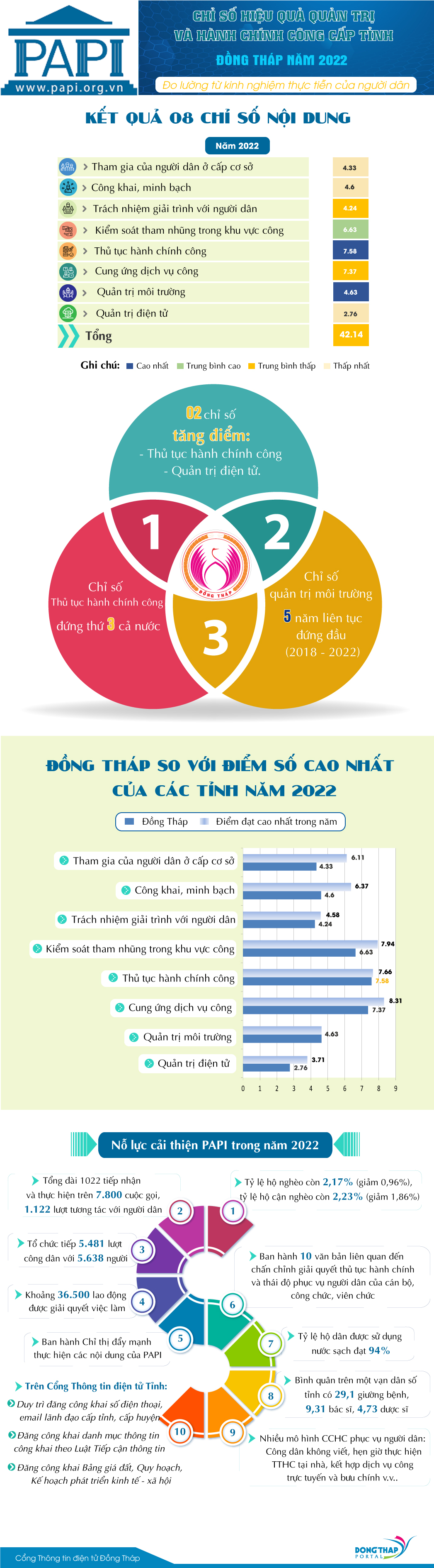 Chỉ số Hiệu quả quản trị và hành chính công cấp tỉnh (PAPI) năm 2022 tỉnh Đồng Tháp đạt 42,14 điểm, trong đó có một số chỉ số tăng điểm và dẫn đầu cả nước. Mời xem infographic