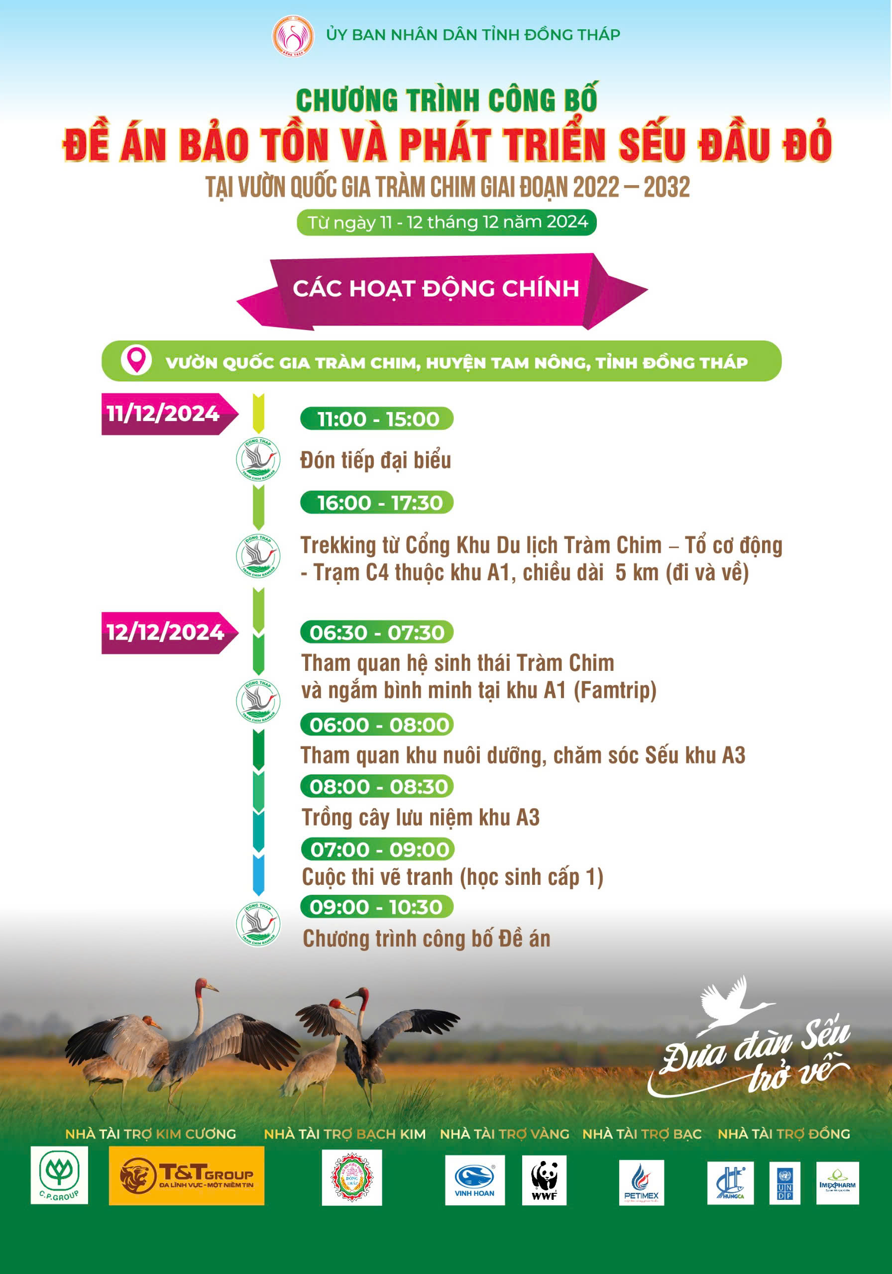 Nhằm quảng bá và kêu gọi sự hỗ trợ, hợp tác của các Bộ, ngành có liên quan, các tổ chức, doanh nghiệp, cá nhân trong và ngoài nước, các chuyên gia, nhà khoa học trong việc bảo tồn đa dạng sinh học, phát triển hệ sinh thái đặc trưng của tỉnh Đồng Tháp; đặc biệt là công tác bảo tồn loài Sếu đầu đỏ quý hiếm tại Vườn Quốc gia Tràm Chim, Ủy ban nhân dân tỉnh Đồng Tháp tổ chức Chương trình công bố Đề án “Bảo tồn và Phát triển Sếu đầu đỏ tại Vườn Quốc gia Tràm Chim giai đoạn 2022 – 2032”. Dưới đây là chương trình hoạt động.