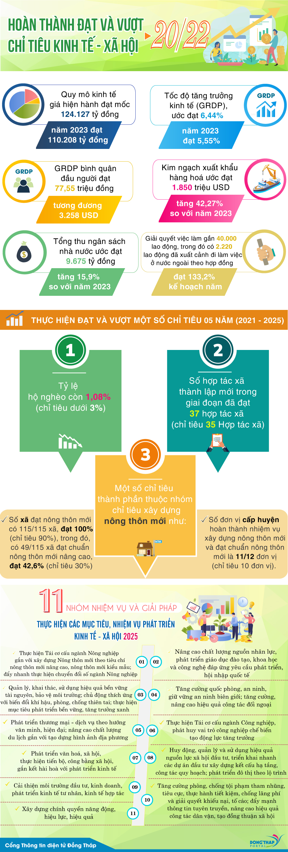 [Infographic] Đồng Tháp: Hoàn thành đạt và vượt 20/22 chỉ tiêu kinh tế - xã hội