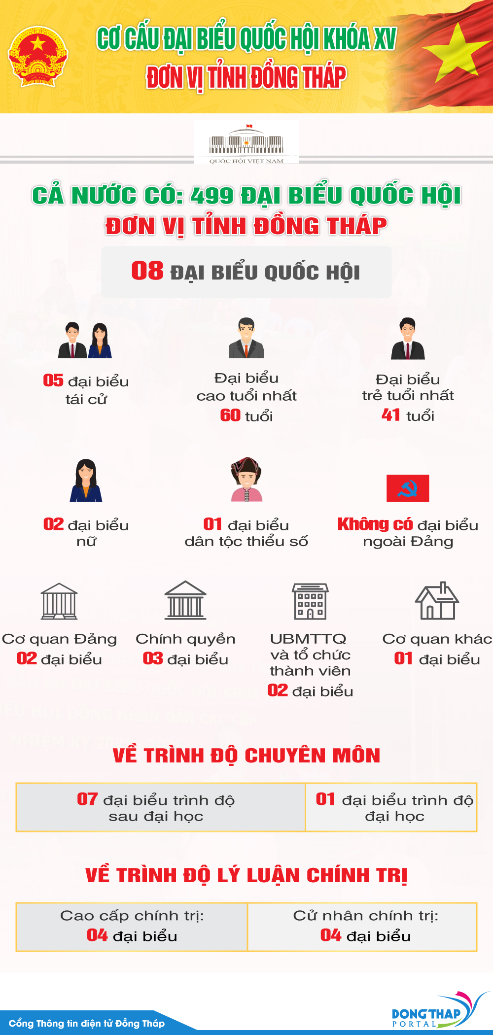 Theo đó, có 499 đại biểu trúng cử đại biểu Quốc hội khóa XV, trong đó đơn vị tỉnh Đồng Tháp có 08 đại biểu trúng cử.