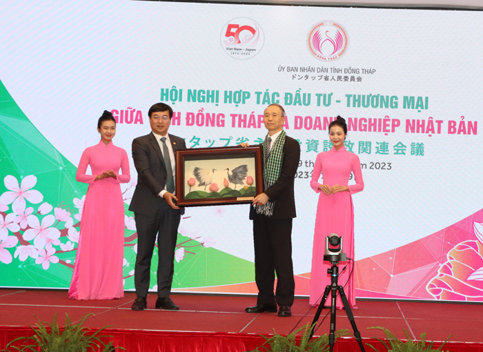 レ・コック・フォン省党書記がドンタップの蓮の花で作ったタンチョウの絵を在ホーチミン日本国総領事に贈呈しました。