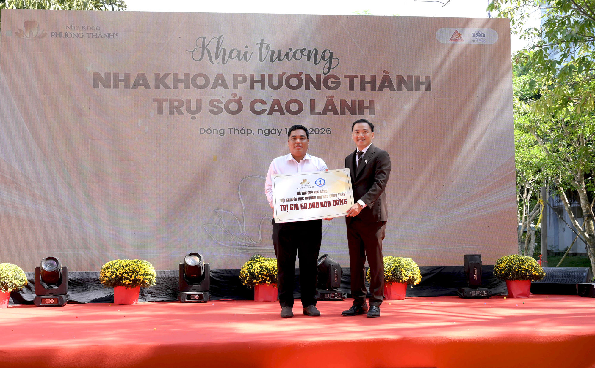 Ông Phạm Kim Thành – Tổng Giám đốc Nha khoa Phương Thành (bên phải) trao bảng tượng trưng kinh phí hỗ trợ cho Trường Đại học Đồng Tháp