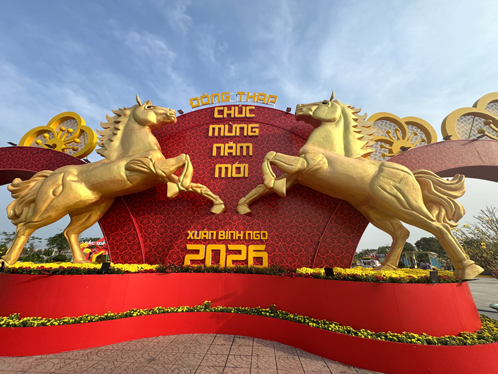Cổng chào “Đồng Tháp chúc mừng năm mới – Xuân Bính Ngọ 2026”, với biểu tượng linh vật năm Bính Ngọ được thiết kế rực rỡ, sẵn sàng đón chào du khách tham quan, du xuân